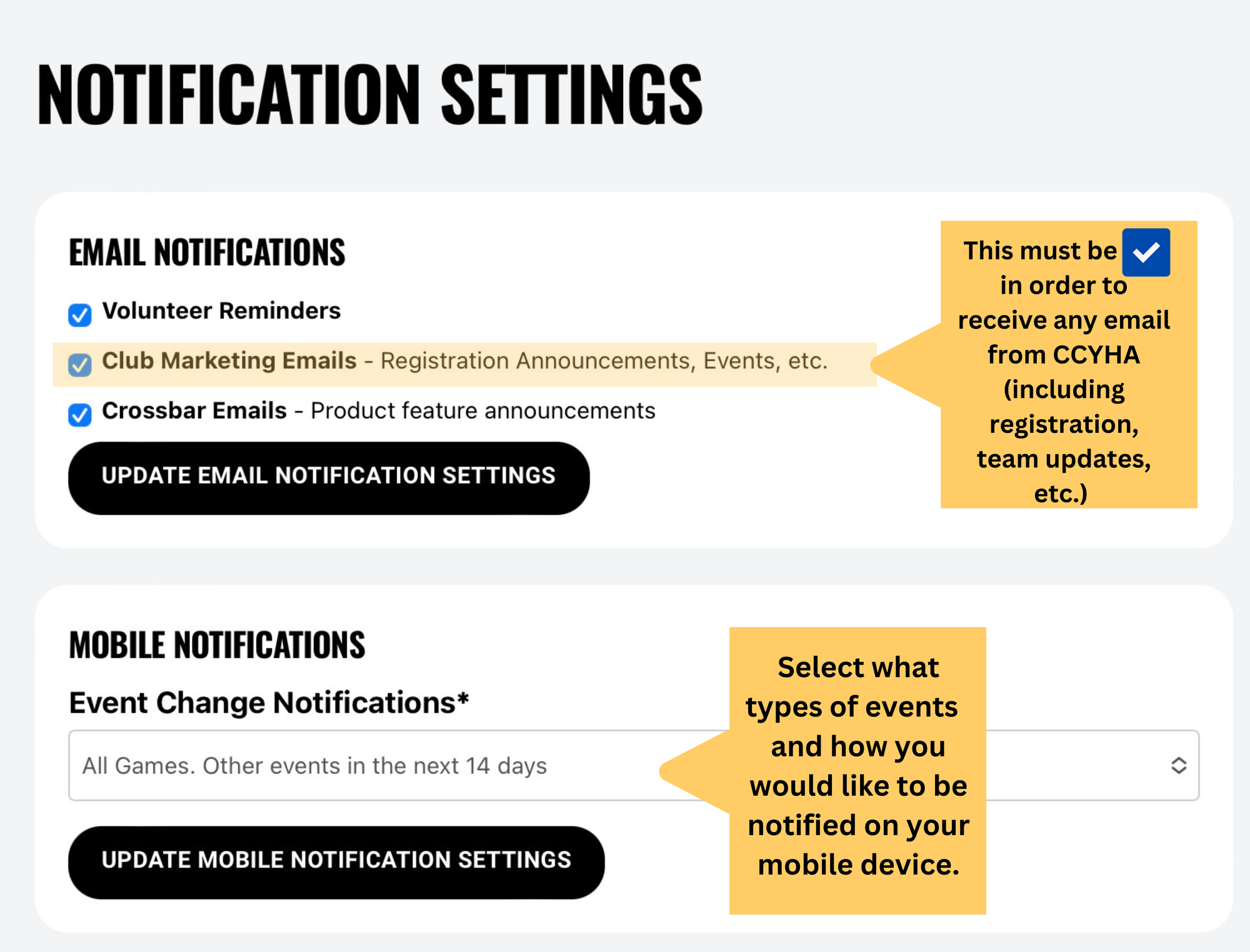 The NOTIFICATION SETTING screen will appear. Make sure Club Marketing Emails is selected. This insures you will receive all emails from Cannons (including from the registrar, admin or your coach).