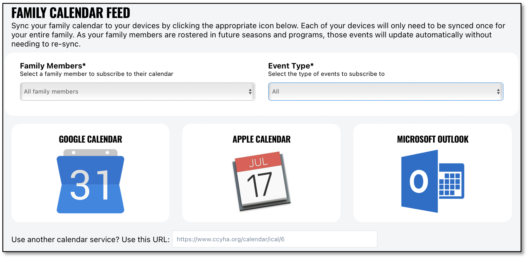 - Select Google Calendar, Apple Calender or Microsoft Outlook or use the listed URL for your team if you used another calendar service.
